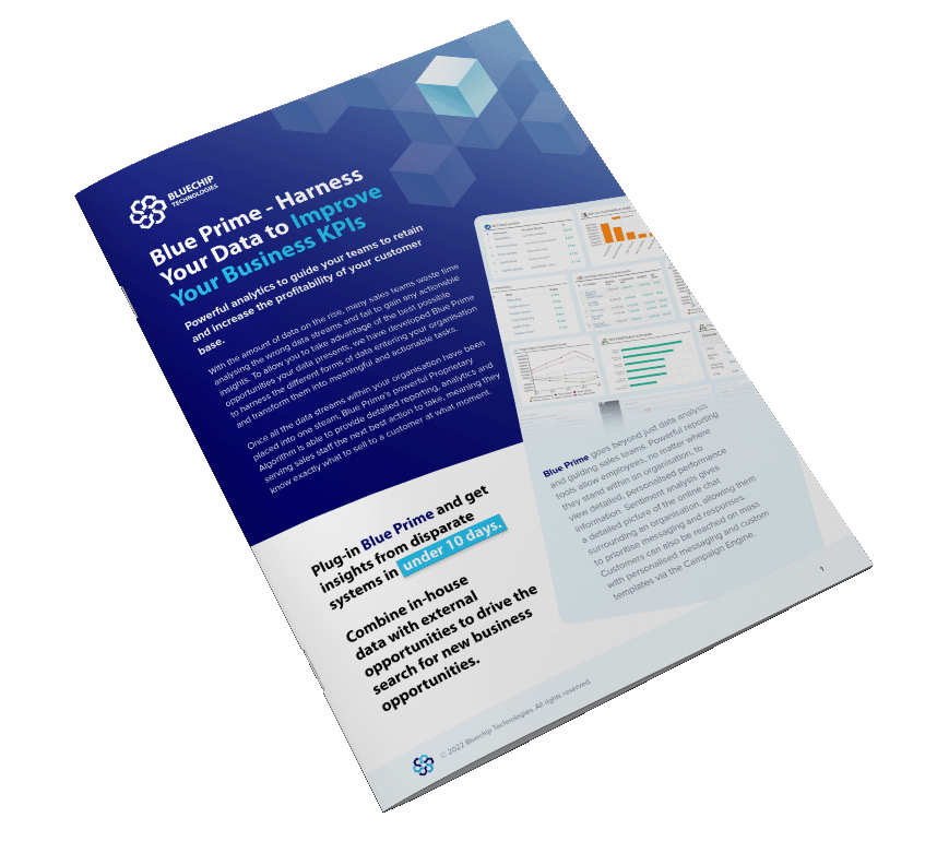 BluePrime is a market-leading platform that pulls and analyses data from multiple sources. The data runs through a variety of business rules and environments to produce a comprehensive insight into you customer’s needs. It also recommends next actions and the perfect selling points to increase customer revenue.